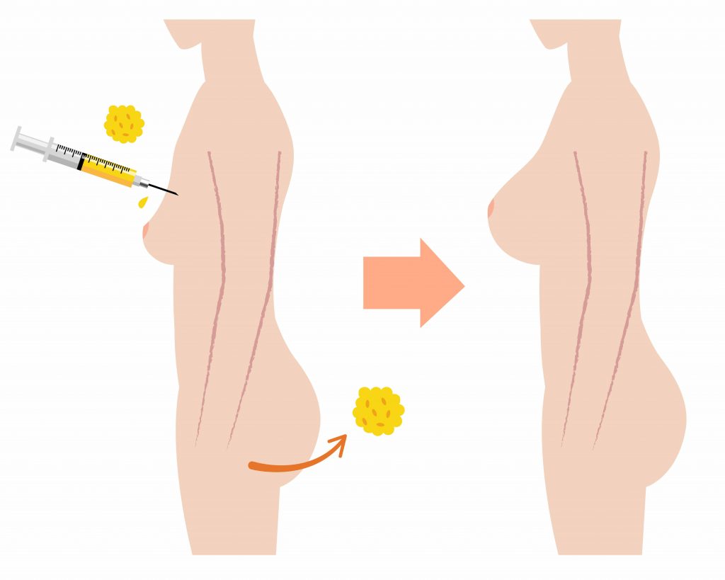 Mỡ từ vị trí dư thừa trên cơ thể như mông, đùi, bụng, hông sẽ được sử dụng để nâng kích thước ngực
