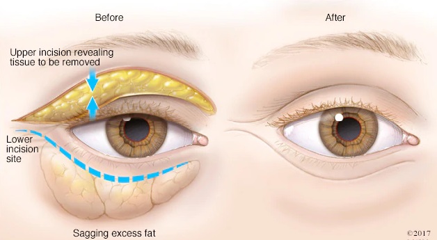 Vết rạch mí trên và mô mỡ cần loại bỏ và vết rạch mí dưới loại bỏ túi mắt