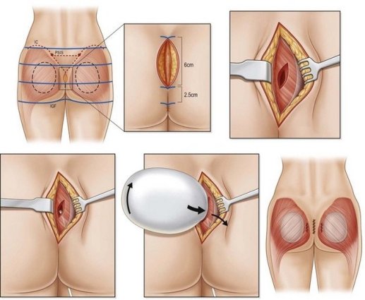 Quy trình phẫu thuật độn mông thường bao gồm các bước: