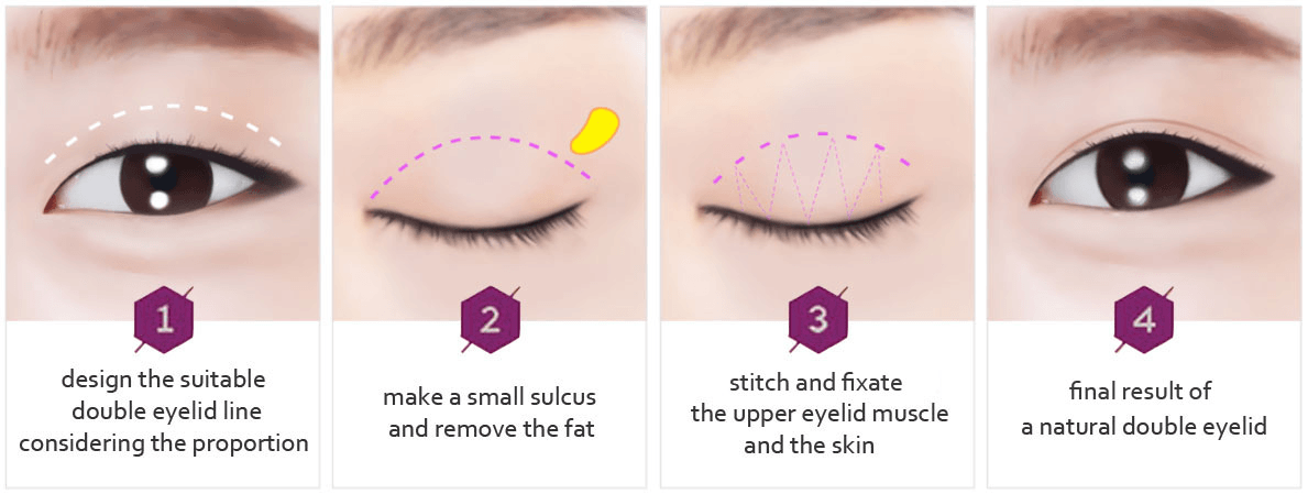 Nếu mí mắt trên của bạn được phẫu thuật, các đường rạch thường được thực hiện dọc theo các nếp nhăn tự nhiên của mí mắt của bạn. Khi các vết mổ đã được thực hiện, các lớp mỡ và da thừa được loại bỏ, và một dải cơ orbicularis oculi bao quanh mí mắt có thể được gỡ bỏ để làm sâu nếp mí mắt.