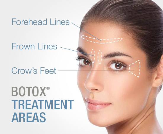 Botox: Đóng băng cơ bắp để ngăn chặn nếp nhăn và nếp gấp trên da gây ra bởi biểu hiện trên khuôn mặt. Chúng thường được tìm thấy ở mặt trên, chẳng hạn như trán và xung quanh mắt.