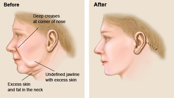 Phẫu thuật tạo hình có thể thắt chặt, treo da quanh đường quai hàm. Nó cũng có thể loại bỏ các nếp nhăn sâu quanh miệng và mũi, treo da và mỡ dư thừa dưới cằm và ở cổ.