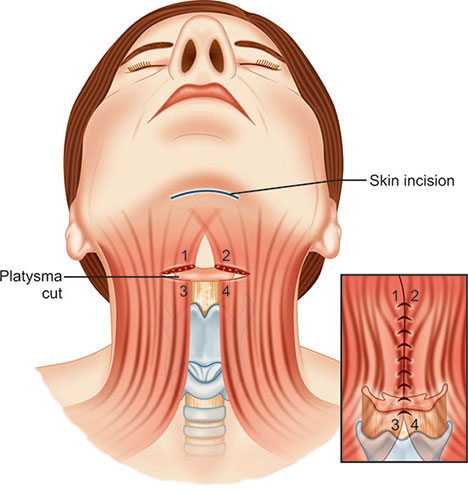 Platysmaplasty thường được tiếp cận thông qua một vết rạch rất nhỏ (~ 2 cm) được giấu trong một trong những nếp nhăn da tự nhiên của bạn ở mặt dưới cằm. Vết rạch này thường rất lành và khó có thể nhận biết được vì nó được giấu trong nếp da tự nhiên và dưới cằm của bạn.