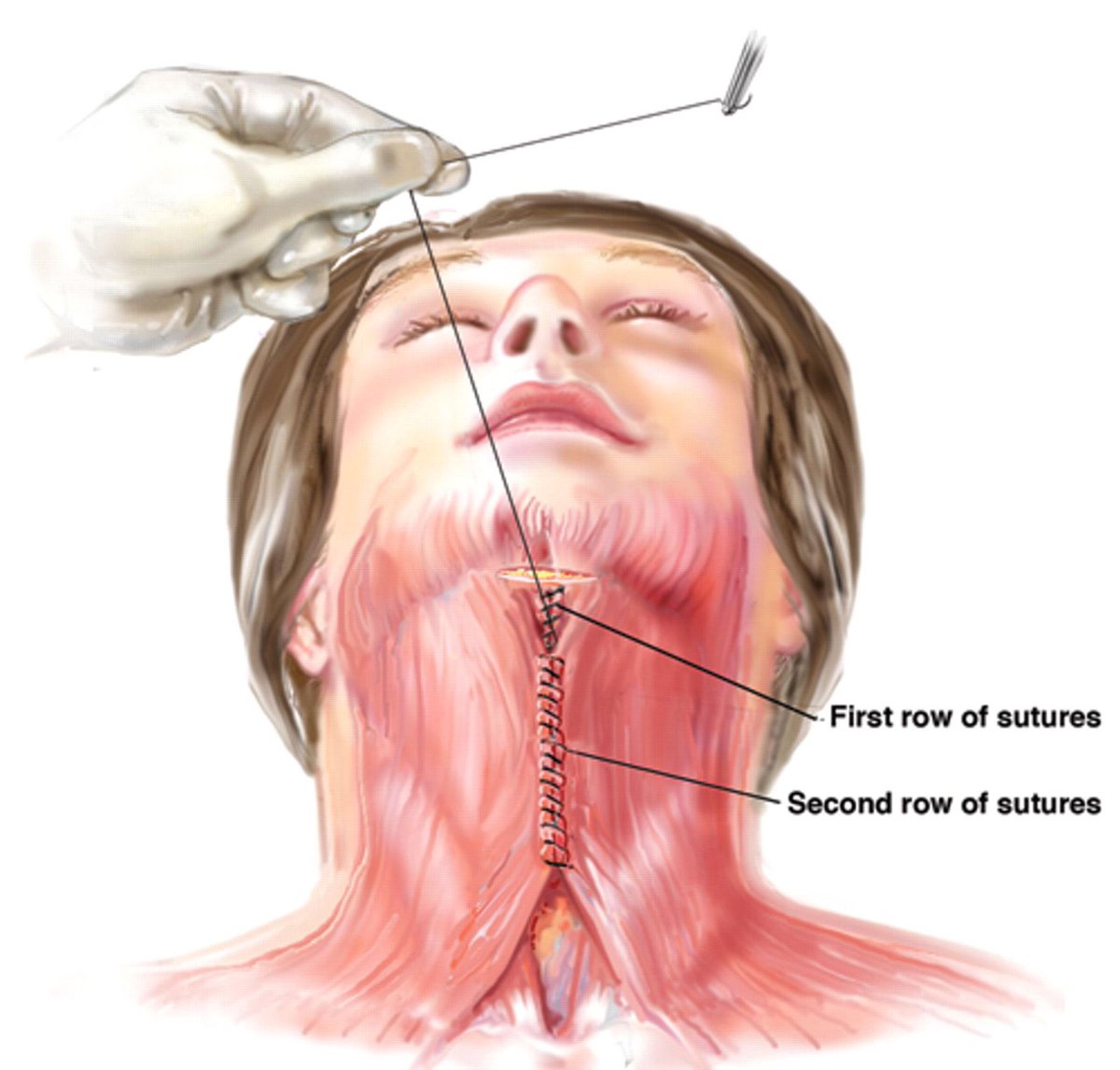 Bằng cách sử dụng chỉ khâu, những cơ này được khâu lại với nhau ở trung tâm bằng một kỹ thuật trông tương tự như thắt một sợi dây. Cũng có thể một phần nhỏ của cơ này sẽ bị loại bỏ hoặc một số biện pháp thắt chặt có sự hỗ trợ của tia laser được sử dụng ở mặt dưới của các lớp sâu hơn của da.