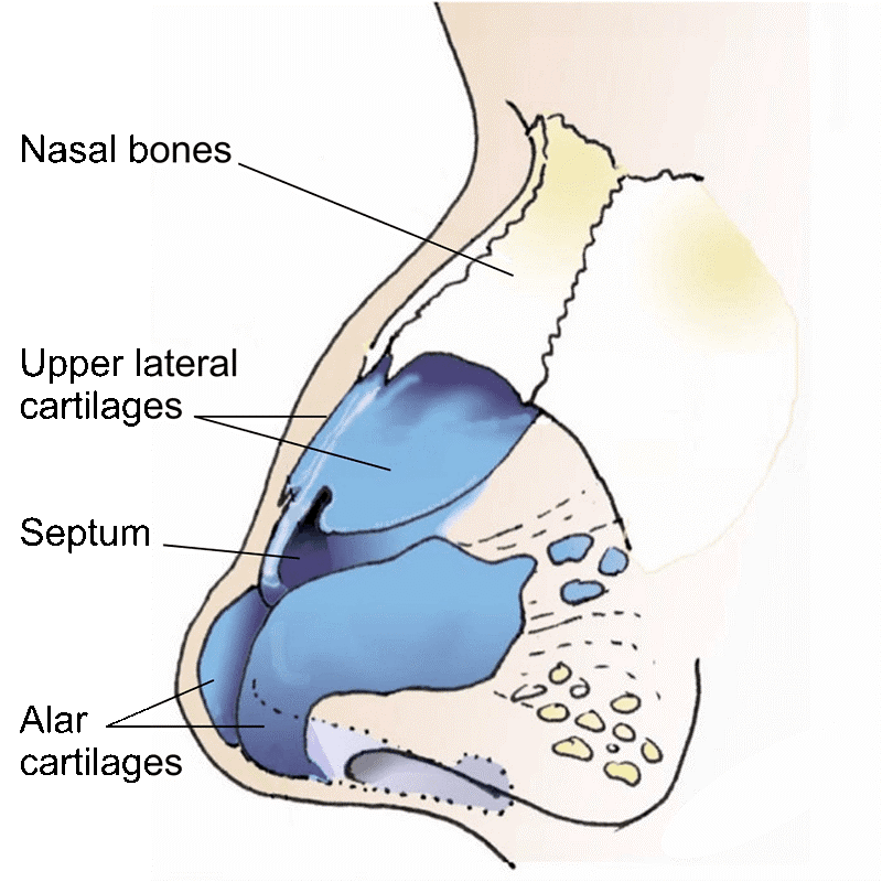 Hình minh họa cho thấy xương và sụn tạo hình mũi.